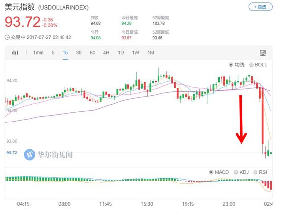 美元指數(shù)迅速回落0.4%,跌破94點(diǎn)關(guān)口。歐元兌美元漲幅擴(kuò)大至61點(diǎn)或0.5%,刷新日高至1.1707,逼近周二所創(chuàng)2015年8月以來(lái)最高1.1712。美元兌日元下滑61點(diǎn),最低觸及111.56,日內(nèi)跌超0.2%。現(xiàn)貨黃金短線上揚(yáng)6.60美元至日高1255.39美元/盎司,漲幅擴(kuò)大至0.4%。